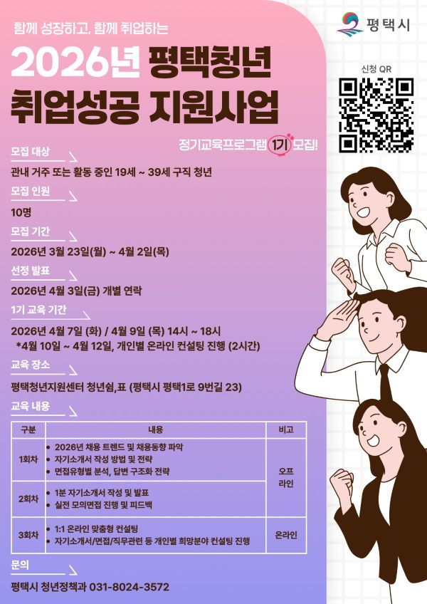 À̹ø Á¤±â±³À° 1±â´Â 3ȸÂ÷ °úÁ¤À¸·Î ¿î¿µµÇ¸ç, 1¡¤2ȸÂ÷ ±³À°Àº 4¿ù 7ÀÏ(È­), 9ÀÏ(¸ñ) 14½Ã~18½Ã±îÁö ÆòÅÃû³âÁö¿ø¼¾ÅÍ¿¡¼­ ¡ãÃë¾÷Æ®·»µå ¹× ä¿ë µ¿Çâ ÆÄ¾Ç ¡ãÀÚ±â¼Ò°³¼­ ÀÛ¼º¹ý ¹× ¸éÁ¢À¯Çüº° ºÐ¼®°ú ´ëÀÀ Àü·« ¡ã¸éÁ¢ 1ºÐ ÀÚ±â¼Ò°³ ½Ç½À ¡ã½ÇÀü ¸ðÀÇ ¸éÁ¢ µîÀÇ ³»¿ëÀ¸·Î ÁøÇàÇϸç, ¸¶Áö¸· 3ȸÂ÷ ±³À°Àº °³Àκ° ¸ÂÃãÇü Ãë¾÷ Áö¿øÀ» À§ÇÑ ¡ã¿Â¶óÀÎ ÄÁ¼³ÆÃ(2½Ã°£)ÀÌ Á¦°øµÈ´Ù.