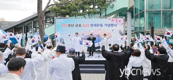 ±ºÆ÷½Ã°¡ ÁÖÃÖÇÏ°í ±¤º¹È¸ ±ºÆ÷½ÃÁöȸ¿Í (»ç)Çѱ¹¿¹ÃÑ ±ºÆ÷ÁöºÎ°¡ °øµ¿ÁÖ°üÇÏ´Â À̹ø ±â³äÇà»ç´Â Âü°¡ÀÚµéÀÌ Ç×Àϵ¶¸³¸¸¼¼¿îµ¿ ±â³äž ÀÏ´ë¿¡¼ 107³â Àü ±ºÆ÷Àå¿¡ ¿ï·ÁÆÛÁø ¸¸¼¼¿îµ¿À» À翬ÇÑ ÈÄ, µ¶¸³¼±¾ð¼ ³¶µ¶, À¯°øÀÚ ¹× °ø¸ðÀü ¼ö»óÀÚ ½Ã»ó, ±â³ä°ø¿¬, 3¡¤1Àý³ë·¡. ¸¸¼¼»ïâ µîÀÇ ¼øÀ¸·Î ÁøÇàµÇ¾ú´Ù.