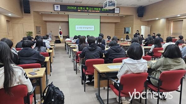 ¼ö¿øÆ¯·Ê½Ã(½ÃÀå ÀÌÀçÁØ)´Â 8ÀÏ ³ó¾÷±â¼ú¼¾ÅÍ ´ë°­´ç¿¡¼­ ÃÊÁß°í 10°³ Çб³ Çлýȸ¿ø°ú Áöµµ±³»ç µî 80¿© ¸íÀÌ Âü¿©ÇÑ °¡¿îµ¥ ¡®2026³â Çб³ 4-¿¡ÀÌÄ¡(H) ½ÅÀÔȸ¿ø ÀԴܽġ¯À» ¿­¾ú´Ù.