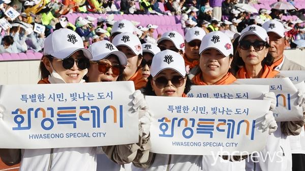 È­¼ºÆ¯·Ê½Ã ¼±¼ö´Ü°ú ½Ã¹ÎµéÀÌ ¡®Æ¯º°ÇÑ ½Ã¹Î, ºû³ª´Â µµ½Ã È­¼º¡¯ ÇÇÄÏÀ» µé°í °üÁß¼®¿¡¼­ ÀÀ¿øÀ» Çϰí ÀÖ´Ù