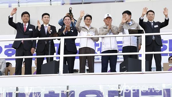 À±¼ºÁø È­¼ºÆ¯·Ê½ÃÀå ±ÇÇÑ´ëÇàÀÌ ¡®Á¦72ȸ °æ±âµµÃ¼À°´ëȸ¡¯ °³È¸½Ä¿¡¼­ ³»ºóµé°ú ÇÔ²² ¼ÕÀ» µé¾î ÀλçÇϰí ÀÖ´Ù