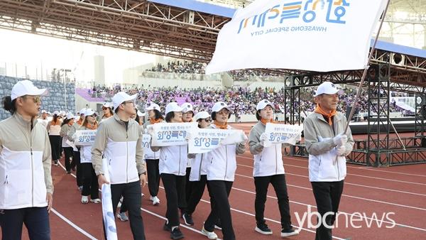 °³È¸½ÄÀº 31°³ ½Ã±º ¼±¼ö´Ü ÀÔÀåÀ» ½ÃÀÛÀ¸·Î ¡ãÃàÇϰø¿¬ ¡ã°³È¸¼±¾ð ¡ã´ëȸ±â °Ô¾ç ¡ã´ëȸ»ç ¡ã¼±¼ö´Ü ¹× ½ÉÆÇ´ëÇ¥ ¼±¼­ ¡ã¼ºÈ­Á¡È­ ÆÛÆ÷¸Õ½º ¼øÀ¸·Î ÁøÇàµÇ¾úÀ¸¸ç, È­¼ºÆ¯·Ê½Ã ¼±¼ö´ÜÀº ´ç´çÇÑ ¸ð½ÀÀ¸·Î ÀÔÀåÇÏ¸ç ¡®Æ¯º°ÇÑ ½Ã¹Î, ºû³ª´Â µµ½Ã È­¼º¡¯ÀÇ À§»óÀ» ¾Ë·È´Ù.