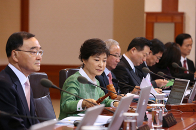 ¹Ú±ÙÇý ´ëÅë·ÉÀÌ 23ÀÏ ¿ÀÀü û¿Í´ë¿¡¼­ ±¹¹«È¸ÀǸ¦ ÁÖÀçÇϸç ÀÇ»çºÀÀ» µÎµå¸®°í ÀÖ´Ù. (»çÁøÁ¦°ø=û¿Í´ë)