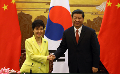 ¹Ú±ÙÇý ´ëÅë·É°ú ½ÃÁøÇÎ Áß±¹ ±¹°¡ÁÖ¼®ÀÌ 27ÀÏ ¿ÀÈÄ Àιδëȸ´ç¿¡¼­ ¿­¸° °øµ¿±âÀÚȸ°ßÀ» ¸¶Ä£µÚ ȯÇÏ°Ô ¿ôÀ¸¸ç ¾Ç¼öÇϰí ÀÖ´Ù.