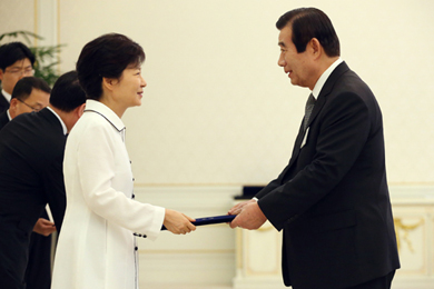 ¹Ú±ÙÇý ´ëÅë·ÉÀÌ 8ÀÏ ¿ÀÈÄ Ã»¿Í´ë¿¡¼­ Çѱ¤¿Á ±¹¹Î´ëÅëÇÕÀ§¿øÈ¸ À§¿øÀå¿¡°Ô À§ÃËÀåÀ» ÁÖ°í ÀÖ´Ù. (»çÁø=û¿Í´ë)