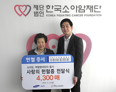 »ï¼ºÀüÀÚ´Â Áö³ 21ÀÏ ¼¿ï½Ã Áß±¸ (Àç)Çѱ¹¼Ò¾Æ¾ÏÀç´Ü¿¡¼ ÀÓÁ÷¿øµéÀÌ ¸ðÀº ÇåÇ÷Áõ 4,300ÀåÀ» Àü´ÞÇÏ´Â Çà»ç¸¦ °¡Á³´Ù.