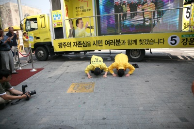°¿îÅ ±¤ÁÖ½ÃÀå È帰¡ ±¤ÁÖÀÇ ½ÉÀåºÎÀÎ ÃæÀå·Î¿¡¼ ¾þµå·Á Å« ÀýÀ» ¿Ã¸®¸ç ÁöÁö¸¦ È£¼ÒÇß´Ù.