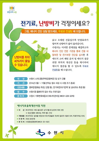 ¼ö¿ø½Ã(½ÃÀå ¿°Å¿µ)°¡ °íÀ¯°¡ ½Ã´ë ¿¡³ÊÁö Àý¾à°ú Àúź¼Ò ³ì»ö¼ºÀå ½ÇÇöÀ» À§ÇØ ¿¡³ÊÁö °¨Ãà ÀáÀç·®ÀÌ Å« °øµ¿ÁÖÅðú »ó¾÷½Ã¼³À» ´ë»óÀ¸·Î ¿À´Â 11¿ù±îÁö ¿¡³ÊÁö Áø´Ü ¹«·á ÄÁ¼³ÆÃ ¼­ºñ½º¸¦ ½Ç½ÃÇÑ´Ù.