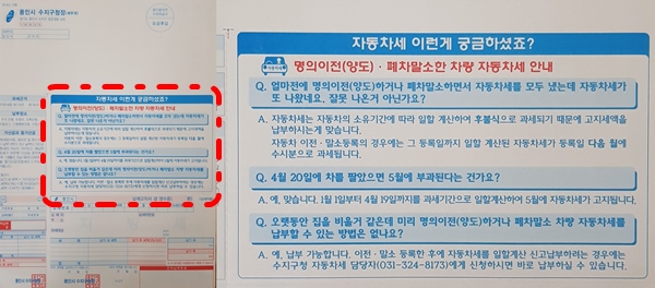 22ÀÏ ¿ëÀνà ¼öÁö±¸´Â ¸íÀÇÀÌÀü ¹× ÆóÂ÷¸»¼Ò Â÷·®¿¡ ºÎ°úµÇ´Â ÀÚµ¿Â÷¼¼ ¼ö½ÃºÐ °íÁö¼¿¡ ¹Î¿øÀÎÀÌ ÀÚÁÖ ¹¯´Â ³»¿ëÀ» Q&A Çü½ÄÀ¸·Î ¾È³»ÇÏ´Â ¹®±¸¸¦ ³Ö¾î ¹ß¼ÛÀ» ½ÃÀÛÇß´Ù°í ÀüÇß´Ù.