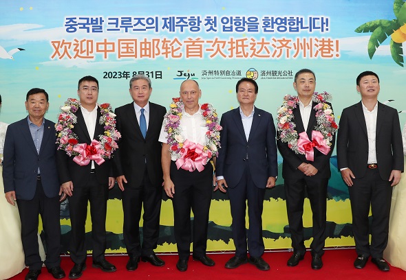 ±¹Á¦¿©°´Å͹̳ο¡¼­´Â ±èÈñÇö Á¤¹«ºÎÁö»ç¿Í Áß±¹ Å©·çÁî ¼±»ç´ëÇ¥°¡ Á¦ÁÖ ±âÇ×±â³ä ¼±¹° ±³È¯½ÄÀ» ÁøÇàÇÑ´Ù. ¿Õ·ç½Å ÁÖÁ¦ÁÖÁß±¹ÃÑ¿µ»çµµ ȯ¿µÇà»ç¿¡ Âü¼®ÇØ Á¦ÁÖ¿¡ ù ÀÔµµÇÏ´Â Áß±¹ÀÎ °ü±¤°´¿¡°Ô ±â³äǰ°ú ²É´Ù¹ßÀ» °Ç³×°í Á¦ÁÖ°¨±Ö Æ÷ÅäÁ¸¿¡¼­ ±â³ä»çÁøÀ» ÃÔ¿µÇÑ´Ù.