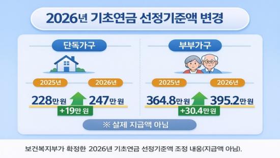 ¡¼YBCNEWS=Àåõ½Ä ±âÀÚ¡½º¸°Çº¹ÁöºÎ°¡ 2026³â ±âÃÊ ¿¬±Ý ¼±Á¤ ±âÁؾ×À» »óÇâ Á¶Á¤Çß´Ù. ´Üµ¶ °¡±¸ ±âÁØ ¿ù ¼Òµæ ÀÎÁ¤¾×Àº 2025³â 228¸¸ ¿ø¿¡¼ 2026³â 247¸¸ ¿øÀ¸·Î,